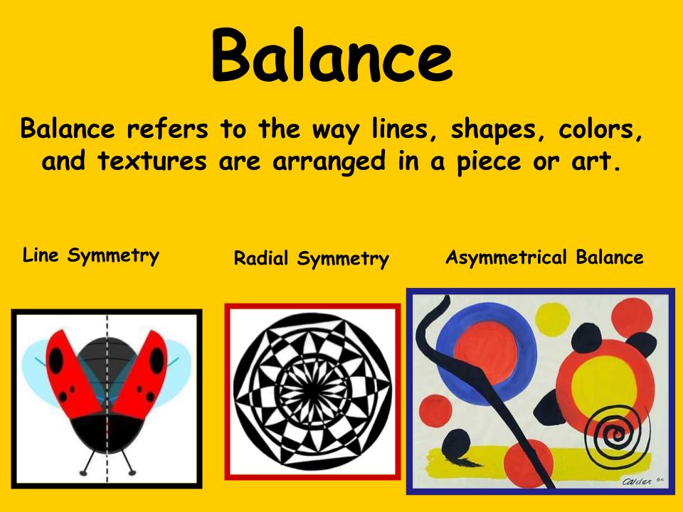 Balance: refers to the sense of distribution of perceived visual weights that offset one another. We feel more comfortable–and therefore find it more pleasing–when the parts of an artwork seem to balance each other. Imbalance gives us an unsettled feeling, and that is something that for most artists is not the desired effect. Some artists, however, deliberately disturb our sense of balance. source