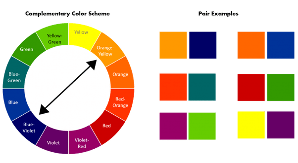 Complimentary Colors: Those colors located opposite each other on a color wheel such as green and red. source