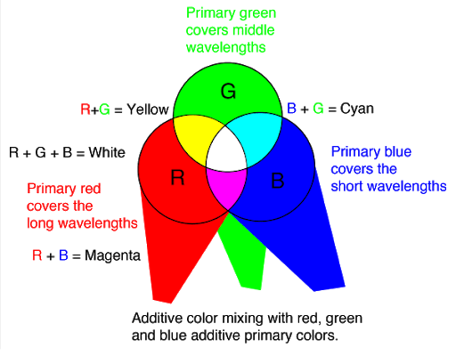 Additive Color: Defined as how colors are made by mixing the primary colors red, green, and blue, and how those mixed colors perceived by the human eye. source